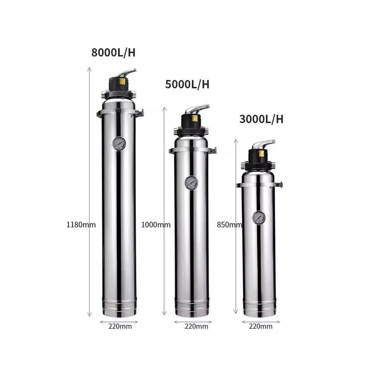 • حجم (طول السومب / Cartridge length): شائع: 20″، 30″، 40″ (اختيار يعتمد على نوع الخرطوشة وسعة التحميل)