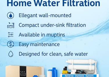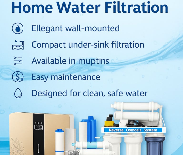 فلاتر المياه المنزلية والمركزية للمنازل متوفرة بنظامي تنقية مكونين من 3و 5 و7 مراحل، وهي مصممة لإزالة الشوائب والكلور والملوثات من المياه، مما ينتج مياه نقية وصالحة للشرب. وضمان توفير مياه صحية وآمنة لجميع أفراد الأسرة